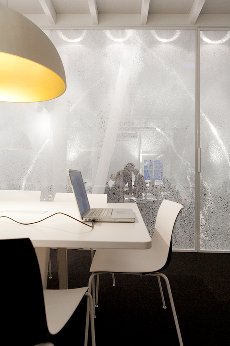 Vertaling van een bedrijfsidentiteit naar een passend interieur, gebruik makend van innovatieve en akoestische materialen, strakke lijnen en een efficiënt lichtplan.