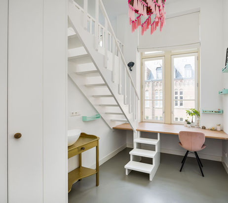 Een deel van het prachtige Lucia klooster verbouwen tot een herenhuis van maar liefst 5 etages. Dat was de opdracht van dit prachtige project. Om het typische karakter van het klooster te respecteren en de enorme hoogtes van de ruimtes juist te accentueren, is een lange maatwerk trap in de smalle gang geplaatst van de begane grond tot aan de nok van de zolderetage. Een imposant trappenhuis.
