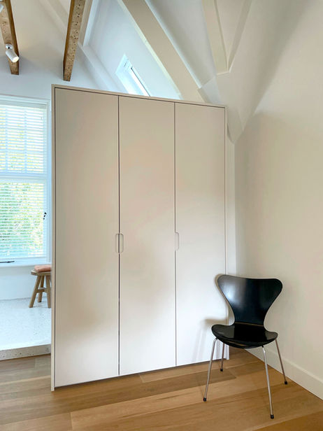 Herindeling van de 1e en 2e etage van de woning met maatwerk ontwerpen. Op de 1e etage het ontwerp van een badkamer, inloopkast, kastwand, bergruimte en bed-wand in de ouderslaapkamerslaapkamer. Op de zolderetage een ontwerp voor een plateau met ingebouwde bergruimte, bed & bureau en maatwerk kasten en schuifwanden.
